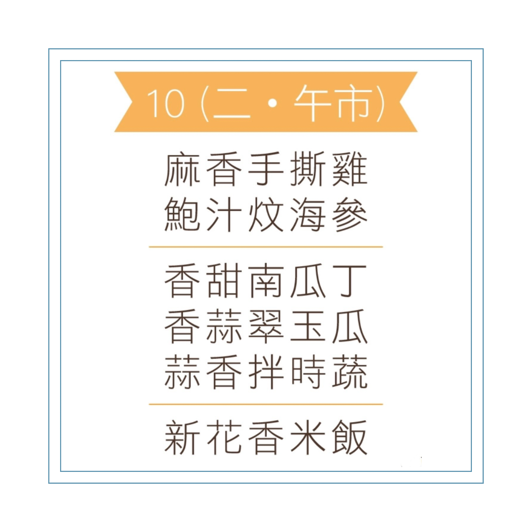 ❇每日固定兩餸三配菜餐單,不設選擇。